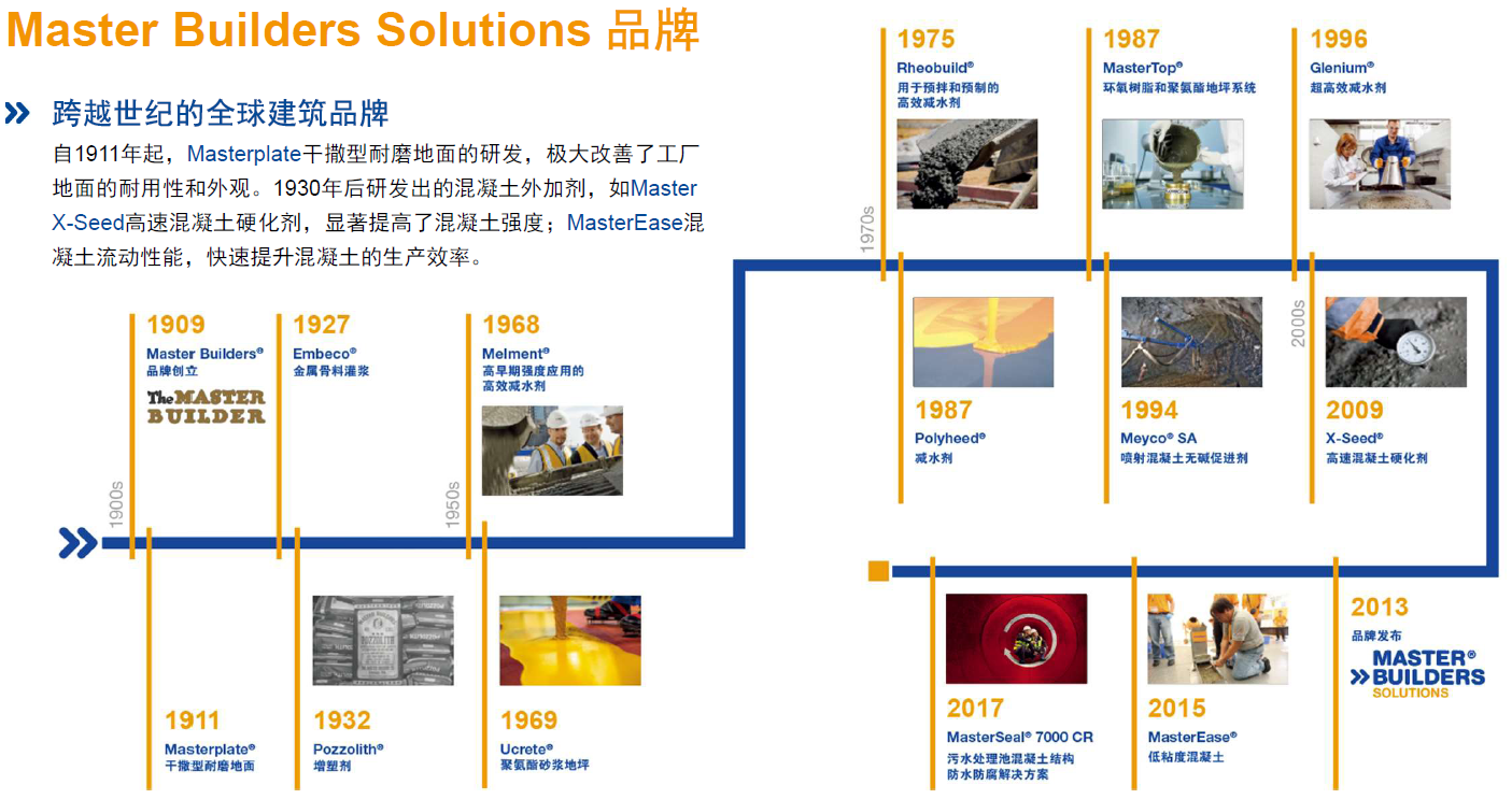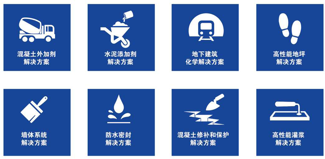 產(chǎn)品組合涵蓋:混凝土外加劑、水泥添加劑、地下建筑化學(xué)解決方案、防水密封系統(tǒng)、混凝土修補(bǔ)和保護(hù)系統(tǒng)、灌漿系統(tǒng)和功能性地坪系統(tǒng)以及陸上和海上風(fēng)能的解決方案。