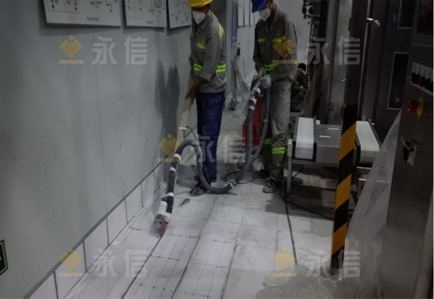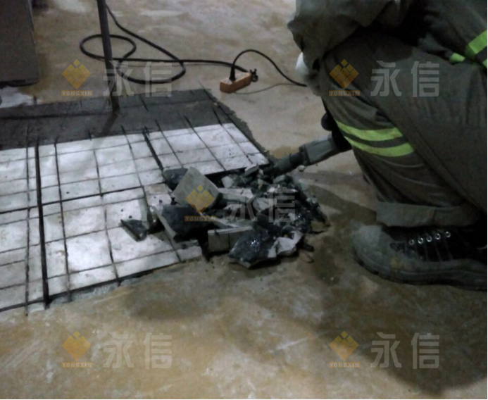 當(dāng)天,按照既定的施工計(jì)劃,現(xiàn)場(chǎng)的施工內(nèi)容是在人流通道區(qū)去除環(huán)氧以及基層處理、灌裝間破損、空鼓地磚破除聚合物修復(fù)及地磚錨固設(shè)置等。